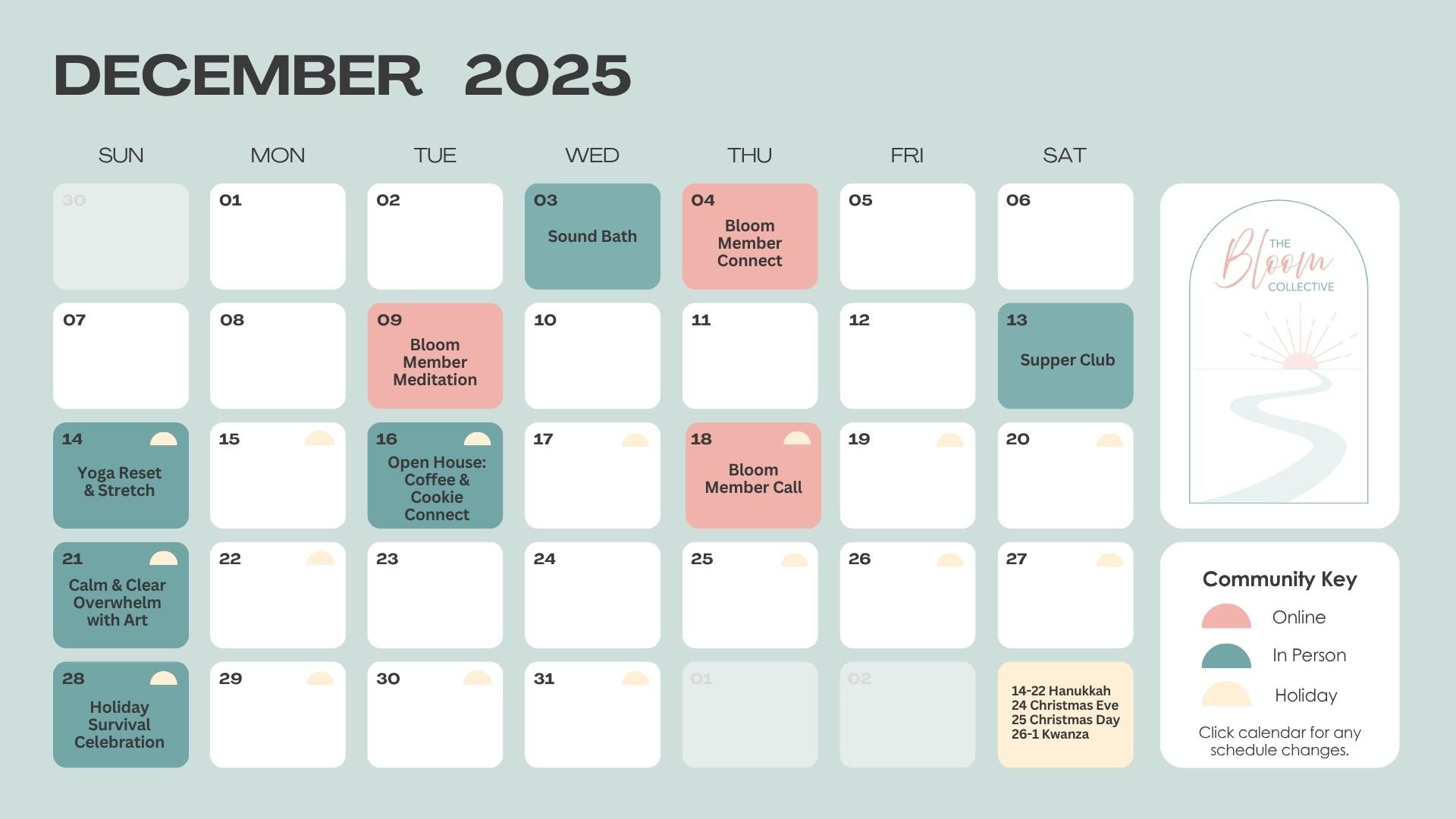 View the calendar for our upcoming events, in person at Bungalow and online, to see which will best support you on your journey.